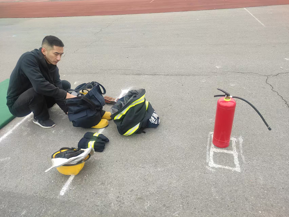經(jīng)過抽簽,湯文第一個出戰(zhàn)。首先是“快速穿過標志桿”,需連續(xù)穿過七根標志桿蛇形區(qū)域,且身體任何部位不得觸碰標志桿。然后是“傷員疏散”,將“傷員”(50kg)疏散到指定“醫(yī)療點”(20米)。第三個環(huán)節(jié)是“快速著裝”,穿戴好滅火戰(zhàn)斗服、戰(zhàn)斗靴、消防頭盔、消防手套、消防滅火腰帶等防護裝備。最后是“滅火器滅火”,手提滅火器到火點進行滅火,直至火焰被撲滅。經(jīng)過一番鏖戰(zhàn),湯文以37秒128的成績完賽,喜獲亞軍。